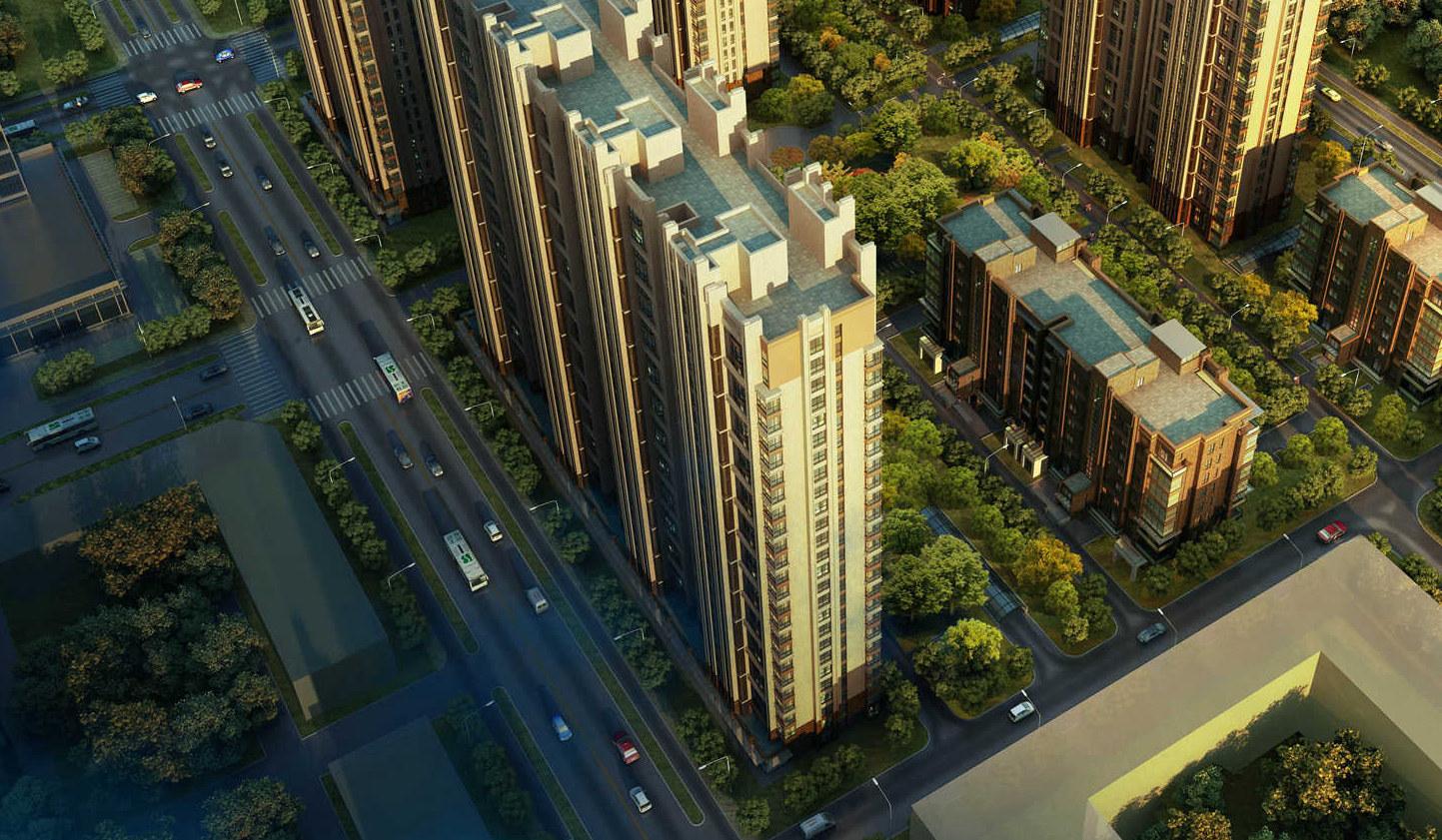 项目花园洋房围绕中心绿地布置,分别沿裕华道南侧道和大理路布置26层及18层板式高层,形成由外向内跌落的城市空间形态。